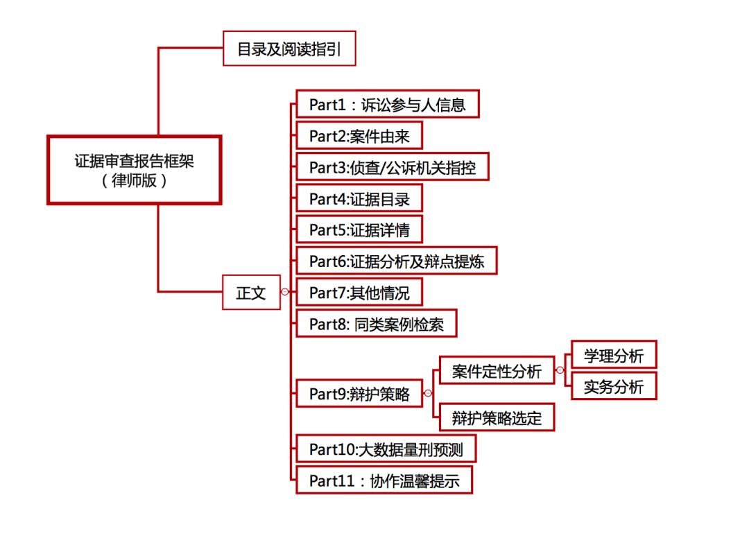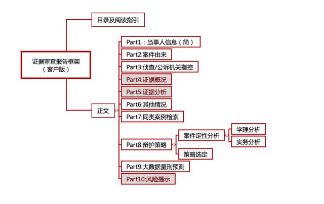 因受众和用途不同,在构建证据审查报告框架时应有所区分,下面分别是律师版和客户版报告的框架。