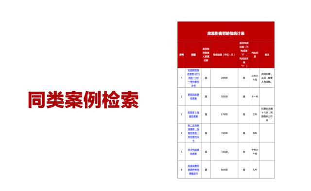 1)单点类似案例。根据单个辩点检索案例,例如电话投案是否构成自首这个点提供类似案例。我们自己曾经就和解赔偿额度这个单点进行同类案例检索,以重建客户对赔偿额度的预期。