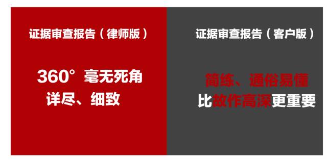正如前面所讲,我所的证据审查报告主要目的是实现刑事辩护的精细化、团队化和可视化,所以律所根据受众对象,把证据审查报告分成2个版本:律师版和客户版。