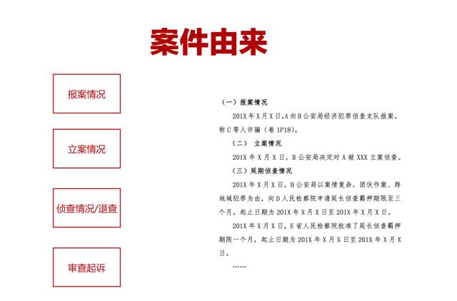 案件由来一般是指案发过程,包括报案、立案、侦查、退查或审查起诉等情况,相当于给案件画时间轴,让受众在最短的时间了解案件的来龙去脉。