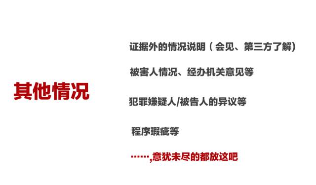其他情况主要是指证据外的信息,例如被害人的和解意愿,被告人/犯罪嫌疑人对证据的异议、经办机关的意见、程序瑕疵、非法证据排除等。