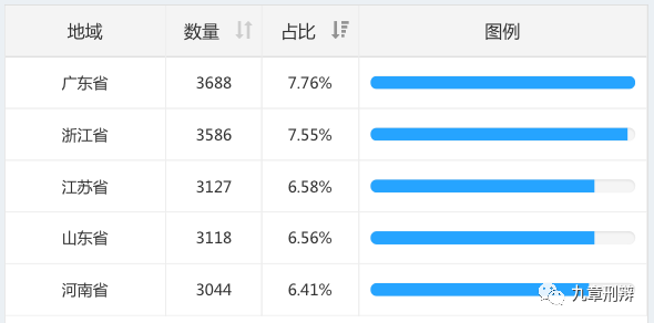 广东省、浙江省、江苏省、山东省,毫无争议的挤进前四名,前四名占全部案件的28.45%,远远超出了四分之一,当之无愧的诈骗之王。